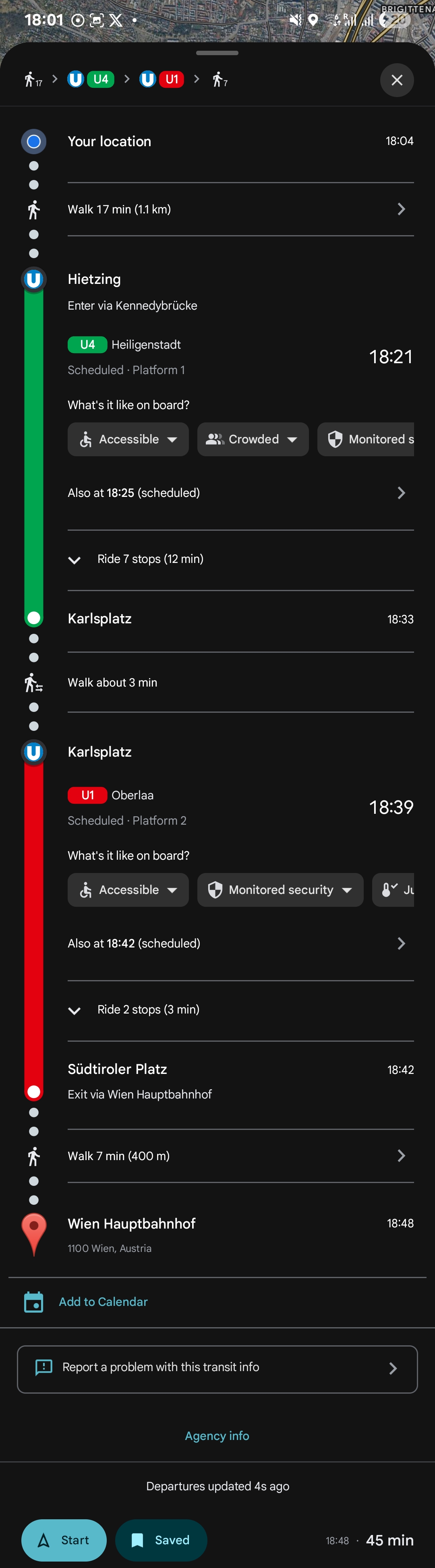 히칭(Hietzing) 역에서 U4 노선의 U반(U-Bahn) 열차를 탔다가, 카를스플라츠(Karlsplatz)역에서 U1 노선의 U반(U-Bahn) 열차로 갈아타고, 쥐트티롤러 플라츠(Südtiroler Platz)역에서 내리는 경로.