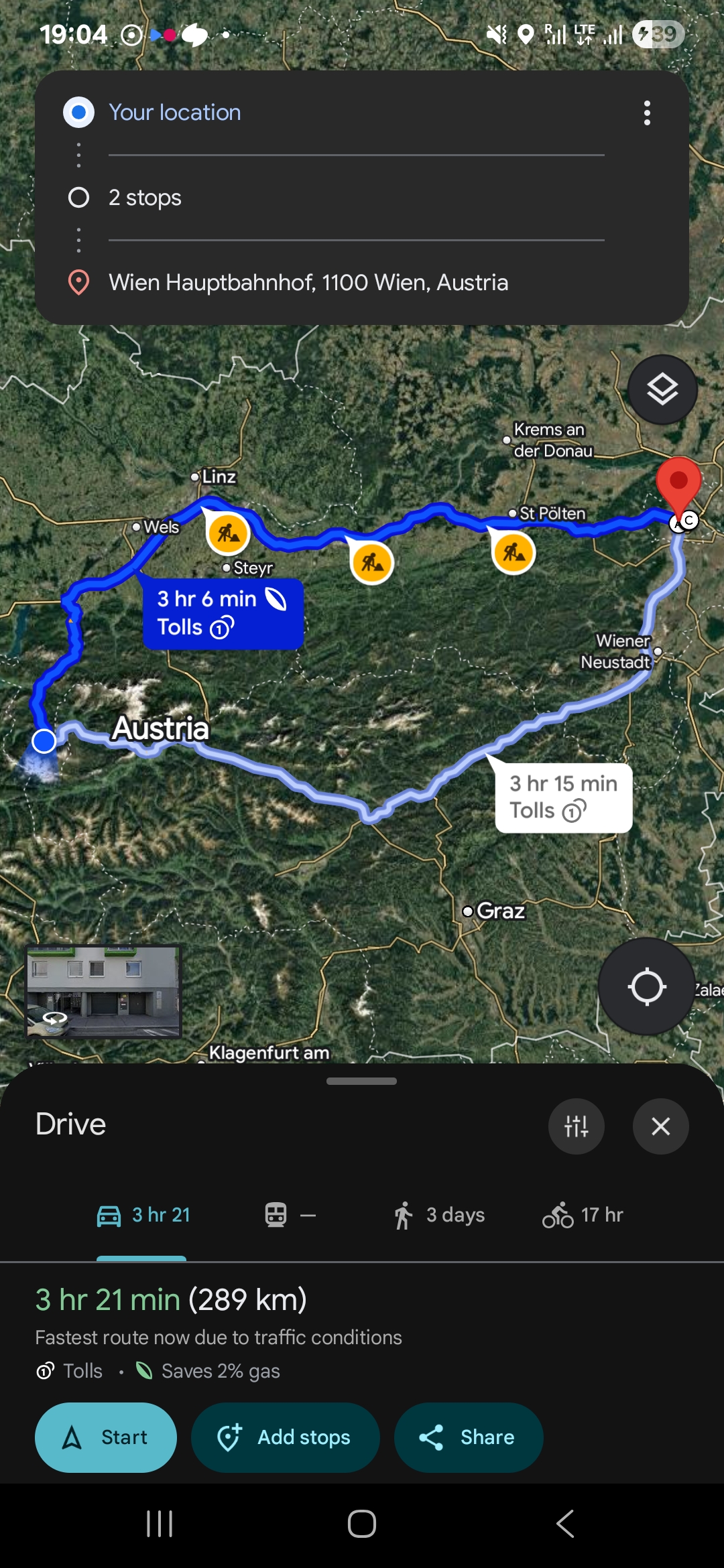 아까 잘츠부르크(Salzburg)에서 주차장 입구를 찾지 못했던 것을 교훈삼아, 빈 중앙역(Wien Hauptbahnhof) 주차장의 입구 주소를 구글에 검색하였고, 그렇게 얻은 주차장 입구 주소를 최종 목적지로 설정하였다.