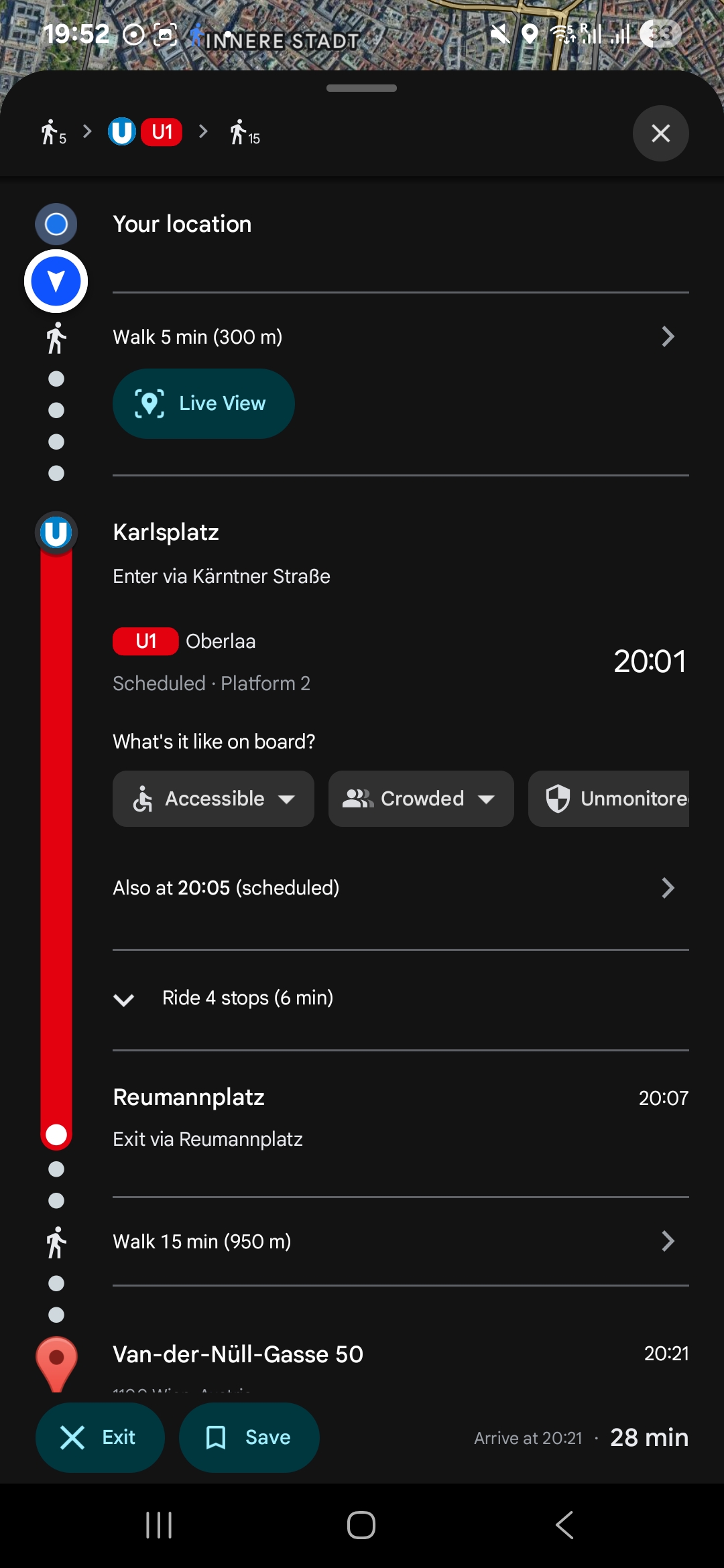 카를스플라츠(Karlsplatz)역에서 U1 노선의 U반(U-Bahn) 열차를 타고, 로이만플라츠(Reumannplatz)역에서 내린 뒤 걸어가는 경로.
