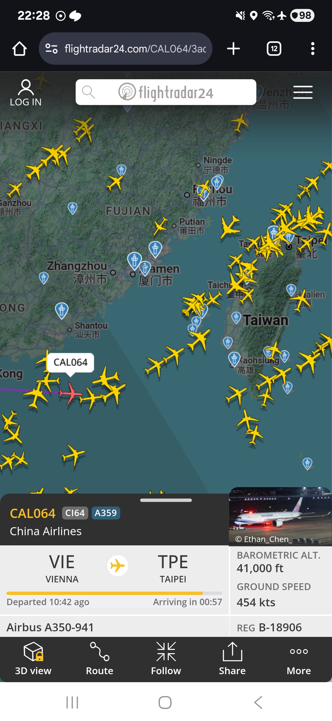 CI64는 6월 20일 05시 30분에 대만 타오위안 국제공항(桃園國際機場)에 착륙.
